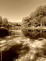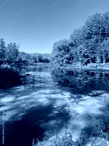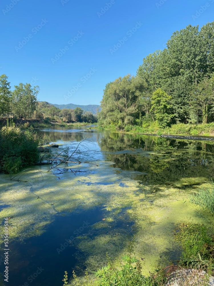 quiet river in the forest with water reflection on a blue sunny sky landscape in Girona, Catalonia