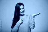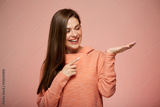 Smiling woman in casual hoody showinh empty hand and pointing finger.
