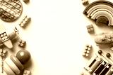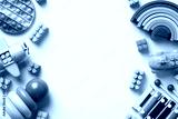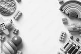 Flat lay baby toys. Top view colorful educational toys on pastel blue background.
