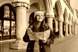 Attractive young female tourist is exploring new city. Redhead girl in hat holding a paper map and smartphone on Market Square in Krakow. Traveling Europe in autumn. Active lifestyle concept