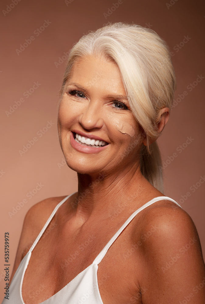 Portrait of a beautiful mature woman with beautiful skin, standing over a beige background