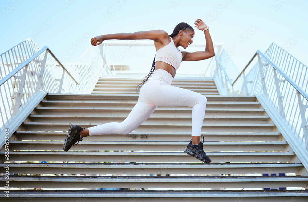 Energy, running and black woman runner on steps for outdoor fitness training, wellness exercise or sports speed challenge. Strong, healthy power of an african athlete with strength workout motivation