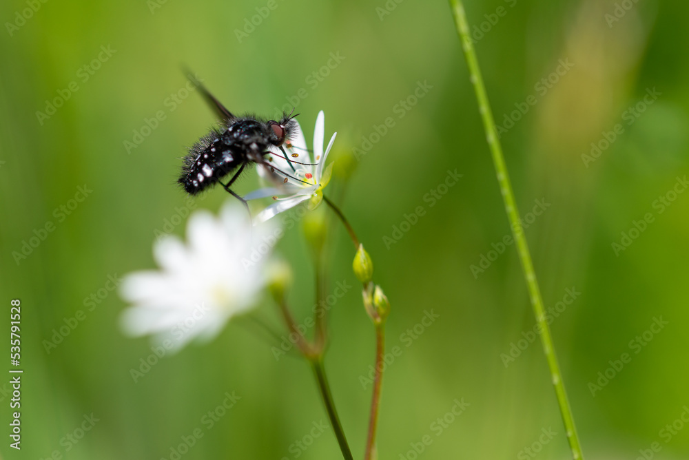 Czarno biała mucha pije nektar z białego kwiatka, rozmyte tło.