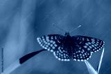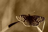 Pomarańczowo czarny motyl dzienny przeplatka atalia (Melitaea athalia), rusałkowate, siedzący na źdźble trawy (1).