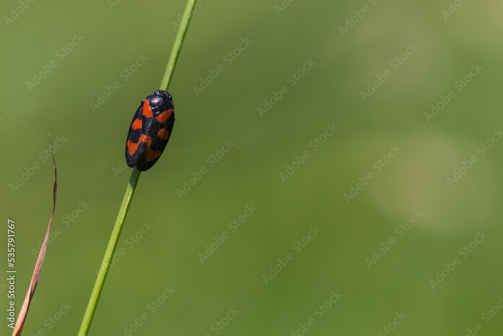 Krasanka natrawka (Cercopis vulnerata) pluskwiak z rodziny krasankowatych, mały czarno czerwony owad siedzący na trawie, rozmyte zielone tło.