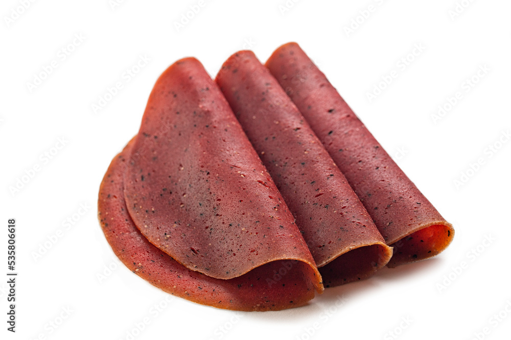 Sliced Spicy Vegan Salami isolated on a white background. Meatless, plant based veggie food, made with legumes, wheat and beetroot.