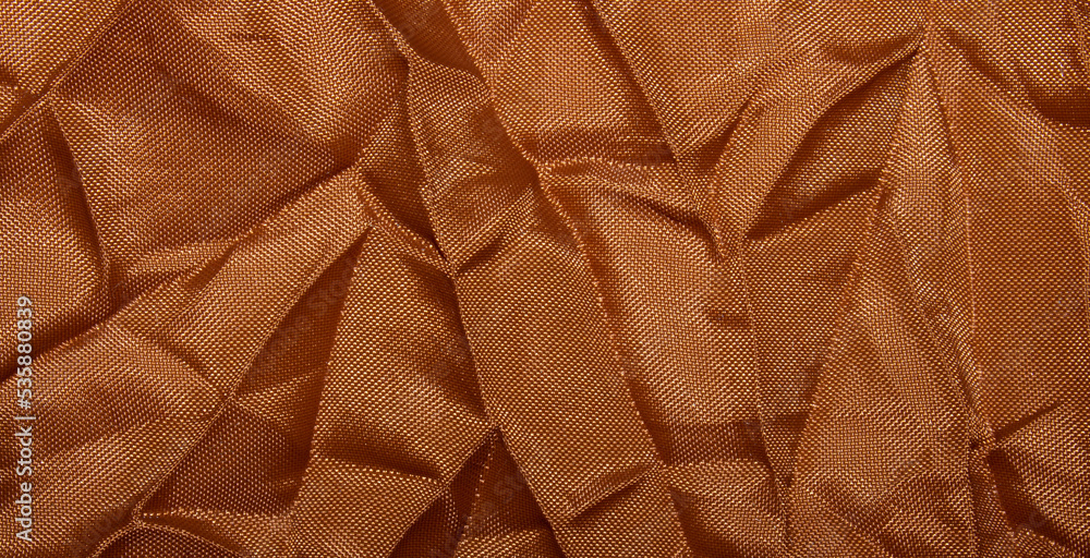 Brown bolognese crumpled fabric.The background of the Bolognese fabric.Brown twill fabric.The fabric is dense with folds.