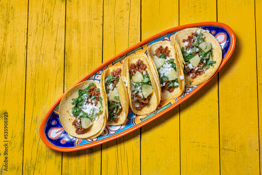 Mexican background with tacos al pastor and mexican sauces. Yellow wooden background, copy space, top view