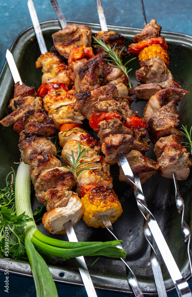 Bbq grilled meat pork, chicken and vegetable skewers on tray. Top view, flat lay