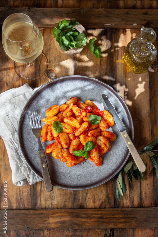 Traditional Italian potato Gnocchi with tomato sauce and fresh basil with glas of white wine. rustic background