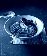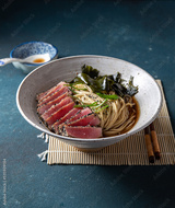 Tuna steak ramen. Japanese soup with noodles ramen, miso, fried tuna steak and seaweed algae. Top view. blue background.
