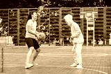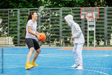 Girl and her younger brother, teenager, play basketball on modern basketball court under open sky