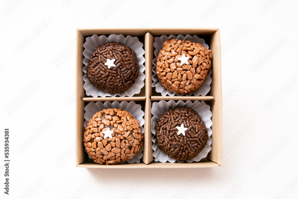 Brigadeiros on a wooden gift box, traditional brazilian bonbon, white background, top view