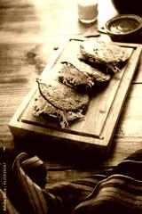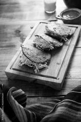 Gordita de Chicharron. Blue Cornmeal dough stuffed with chicharron prensado. Traditional Mexican appetizer commonly accompanied by cilantro, onion and hot sauce