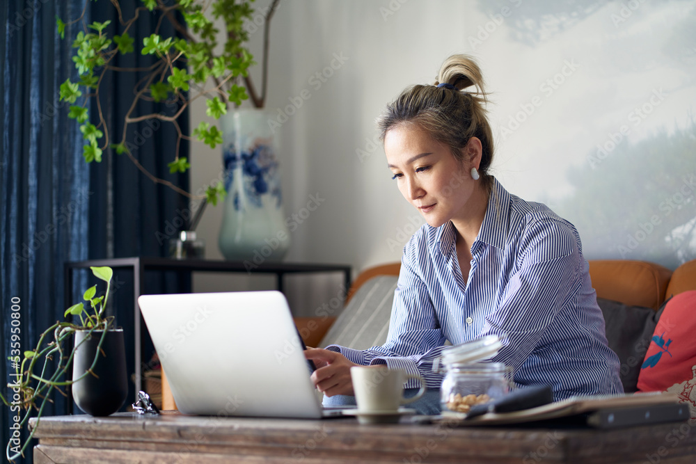 mature asian woman working from home using laptop and cellphone