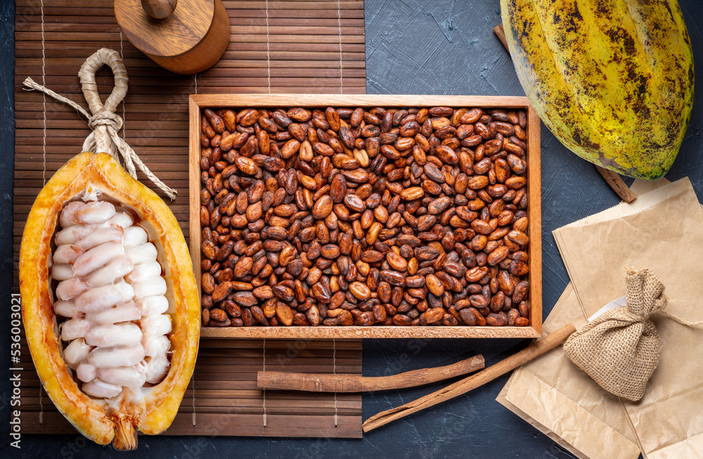 Roasted Cocoa beans on brown wooden plate, Aromatic Cocoa beans in wooden plate on wooden table.