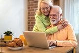 Smiling senior couple using laptop at home in living room.