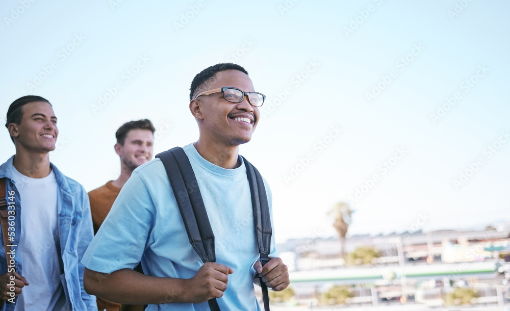 Student, education or travel with a man and friends walking to class on university or college campus as exchange students. Study, scholarship and learning with a male friend group in a city or town