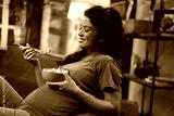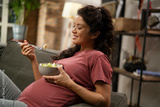 Pregnant woman eating fuit at home. Beautiful pregnant woman enjoy in healthy meal.