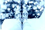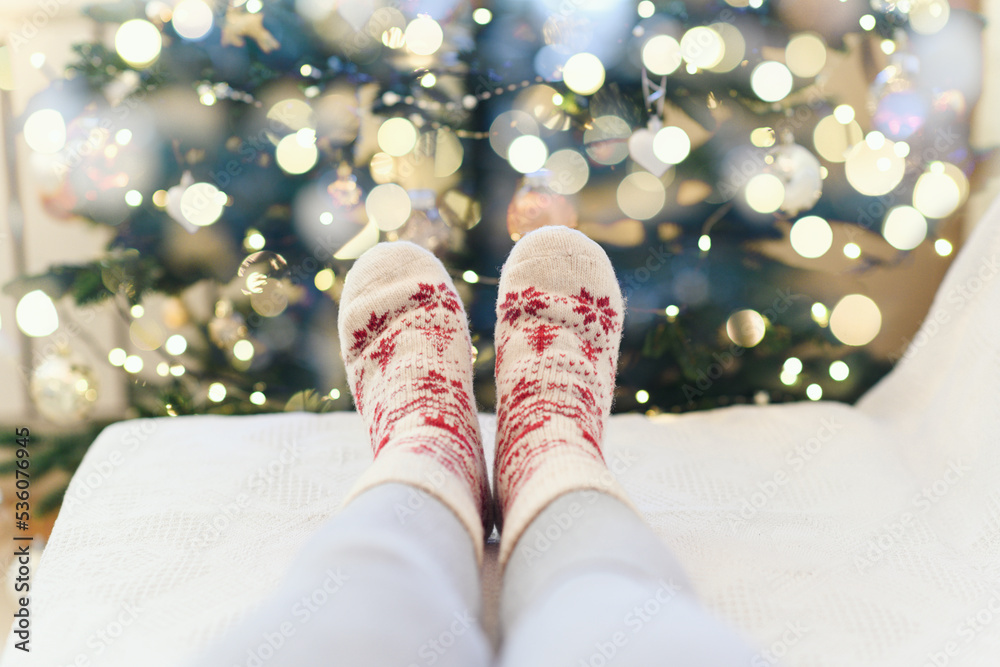 A woman in woolen socks lying on the sofa near Christmas tree with garland