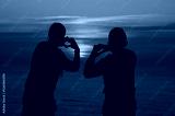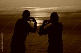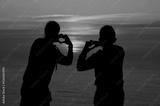 Czarne ludzkie sylwetki na tle zachodzącego słońca. Krajobraz morski.
