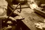Jeweler at work in jewelry. Desktop for craft jewelry making with professional tools. Close up view of tools. Thailand.