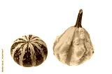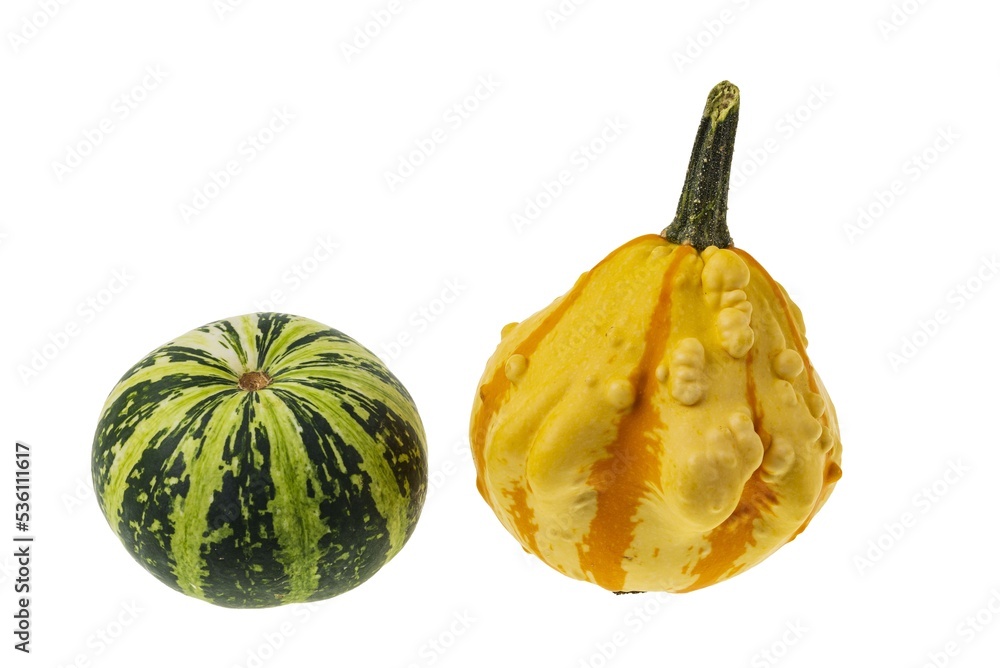 Beautiful view of green and yellow decorative pumpkins isolated on white background. Halloween concept.