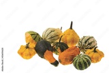 Beautiful view of colorful decorative pumpkins on white background. Halloween concept.