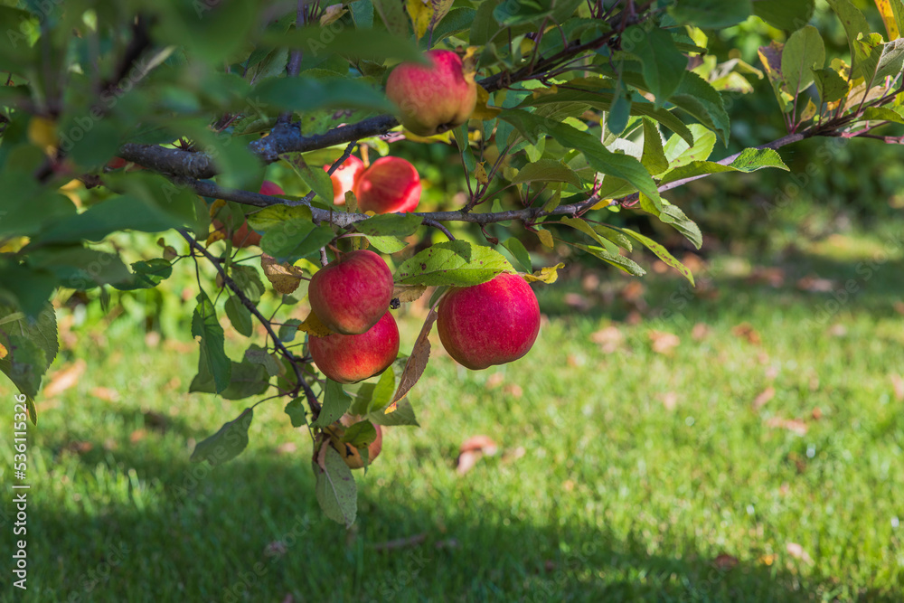 Beautiful close up view of ripe red apples on tree in garden. Fallen yellow leaves on green grass lawn on background.