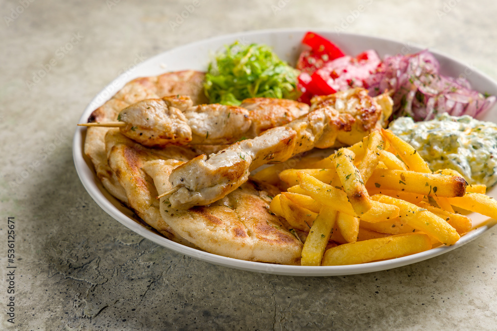 souvlaki with chicken and pita on white plate, Greek cuisine macro close up