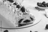 meringue roll with raspberries and pistachios on white marble table macro close up