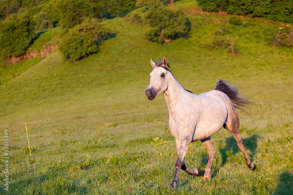 Gray Arab horse gallops on a green meadow