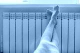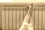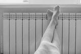 Woman's legs in winter sweater and grey long socks is touching home radiator