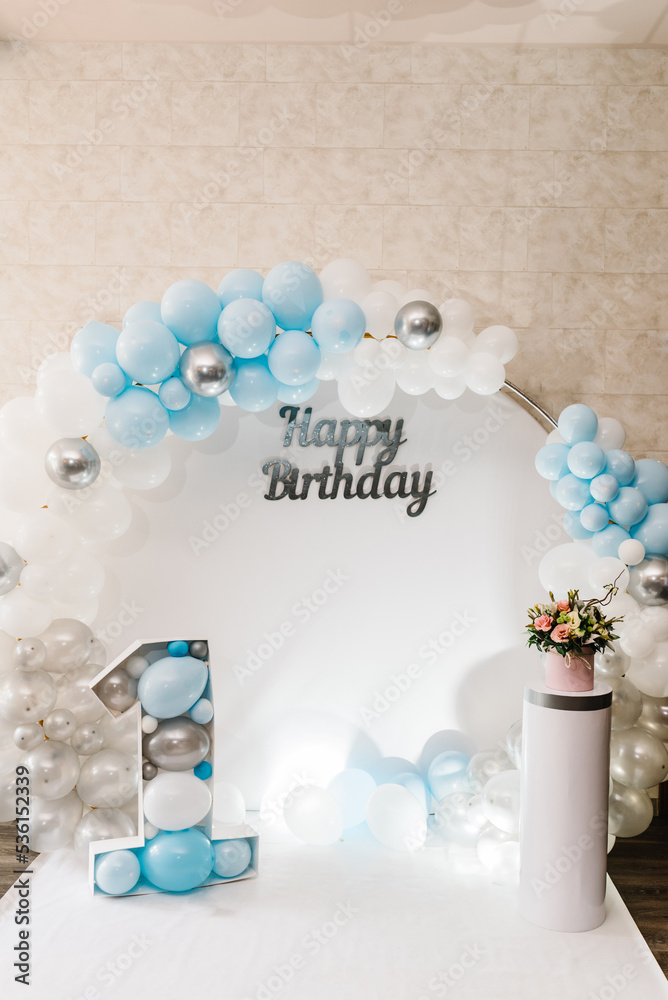 Arch decorated with blue, white, grey, and silver balloons. Baby one party. Trendy arch for 1 year. Reception at a birthday party.
