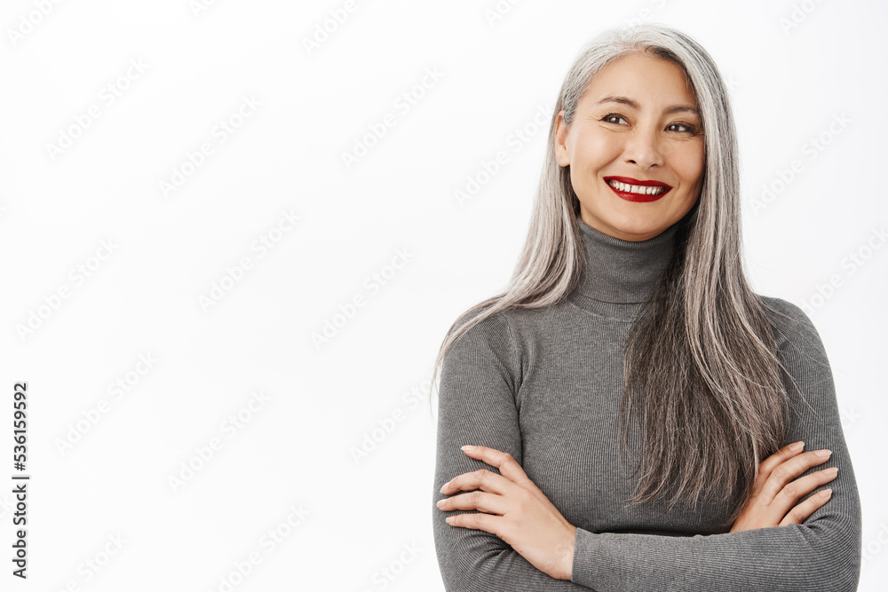 Portrait of beautiful, healthy smiling middle aged asian woman, cross arms on chest, looking confident and happy, standing over white background