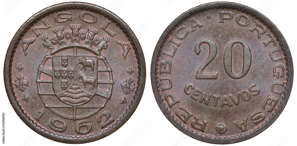 Portuguese Angola Angolan bronze coin 20 twenty centavos 1962, Angolan shield with designs in front of stylized globe, date below, denomination,