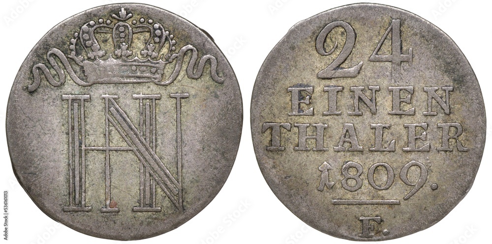 Germany German Westphalia silver coin 1/24 one twenty-fourth of a thaler 1809, ruler Hieronymus Napoleon, French occupation, crowned monogram, denomination and date,