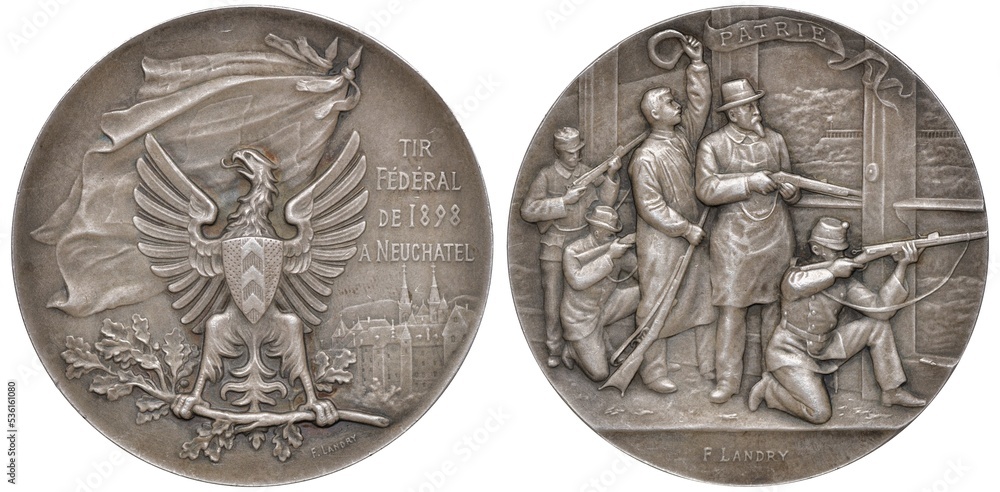 Switzerland Swiss silver medal 1898, subject Shooting festival in Neuchatel, eagle with shield on chest holding oak branch in front of flag, shooters with rifles in position,