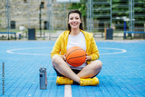 Female athlete is resting during break on basketball court, drinking water. Sport and hobby concept