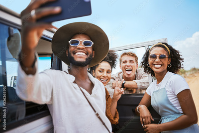 Phone selfie, friendship and car road trip or nature safari holiday travel in Africa together happy for adventure. Mobile photography of excited men, women or young group of people on summer vacation