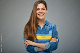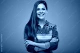Smiling confident woman builder in blue overalls standing with arms crossed.