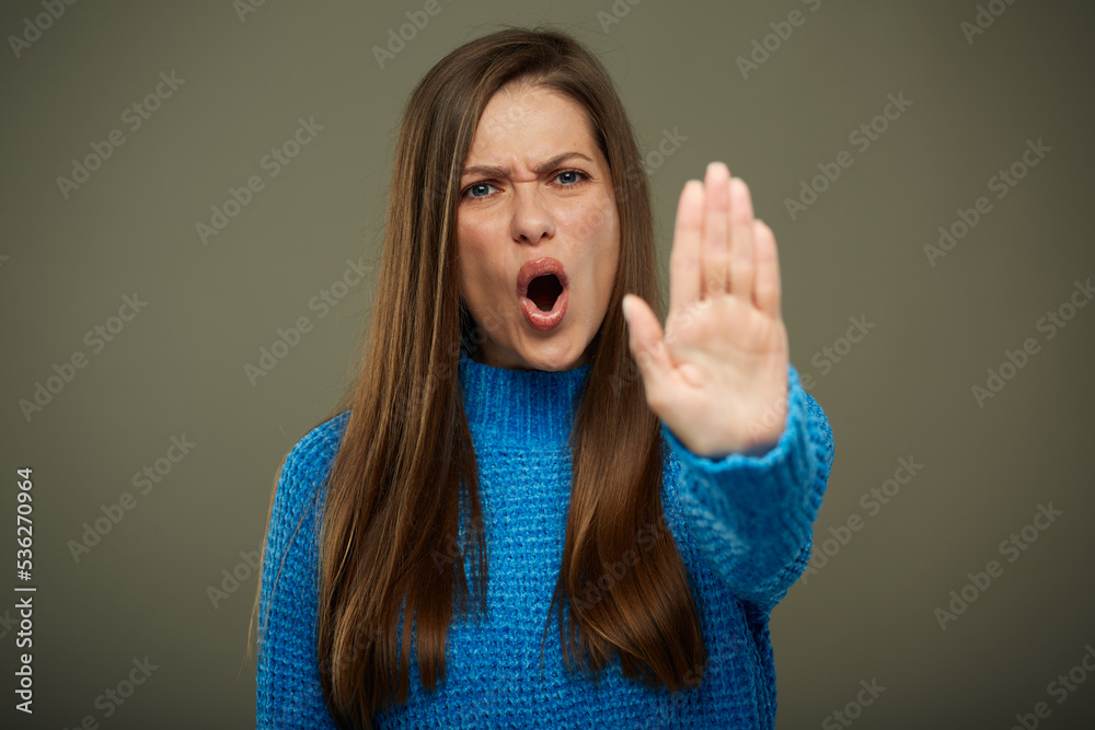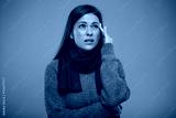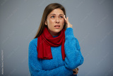 Sick woman with allergy or flu, cold symptoms and headache touching head and looking up. isolated portrait.