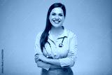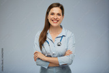 Smiling doctor woman holding stethoscope standing with arms crossed. Isolated portrait of female medical worker on blue background.