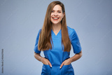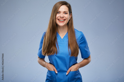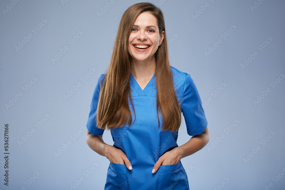 Smiling happy nurse woman in blue medical uniform. Isolated female portrait.