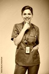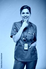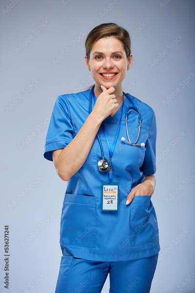 Young thinking nurse woman in blue medical suit. Isolated female portrait.