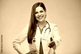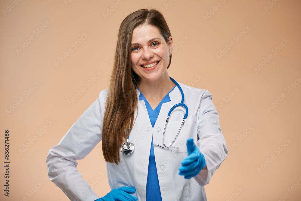 Woman doctor in white coat wearing blue gloves making handshake. Isolated portrait.
