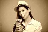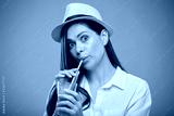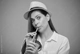 Woman in white shirt drinking orange juice with straw. Isolated female advertising portrait.