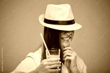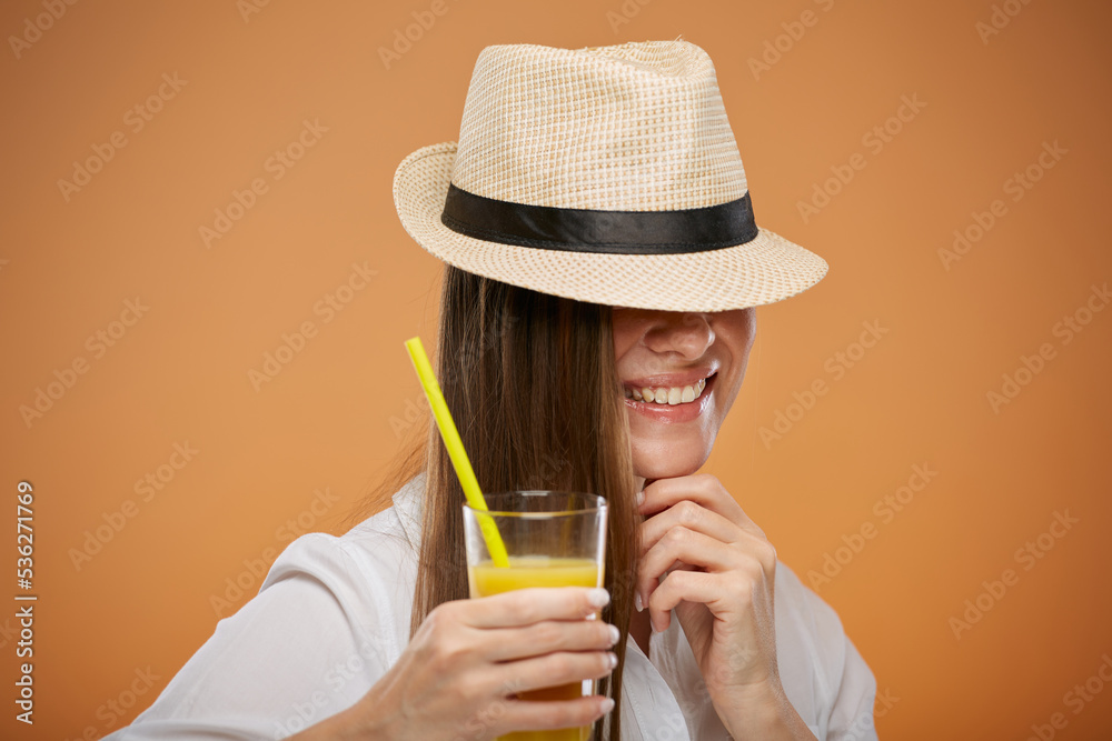 Happy woman hiding her eyes with hat tilting face down and holding orange juice. Isolated female advertising portrait.