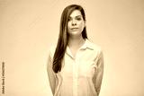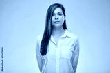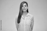 Serious woman in white shirt. Isolated female portrait.