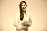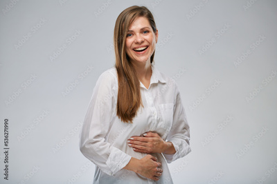 Happy healthy woman has no stomach problems. isolated portrait on white.
